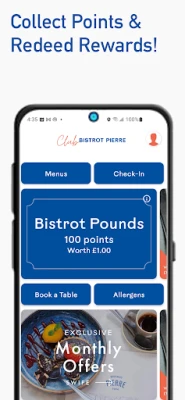 Features of the App - Automatically join Club Bistrot Pierre - Collect points on every order and Redeem Rewards at any Bistrot Pierre restaurant - See your points balance in real time as well as all your available rewards - View our menus - Easily find your nearest Bistrot Pierre restaurant, get directions or tap on the number to call - Book your table or event