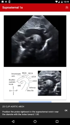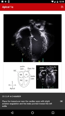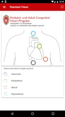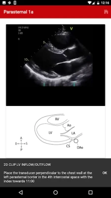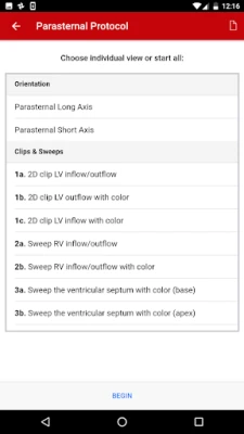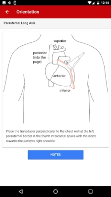 The exact images and the order in which the images and views are obtained varies by institution. Each protocol (subcostal, parasternal, apical or suprasternal) can be followed in order by clicking on the next tab at the bottom of the page or you can click on an individual numbered view within the protocol list to be taken directly to that view. The name of the view and instructions will pop-up automatically at the bottom of the page. The instructions and additional notes can also be found in the “NOTE” button at the bottom of the page.