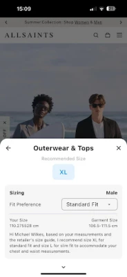 Our app compares your body scan to real retailer size guides (not generic charts) and recommends the best-fitting size for each brand and item.